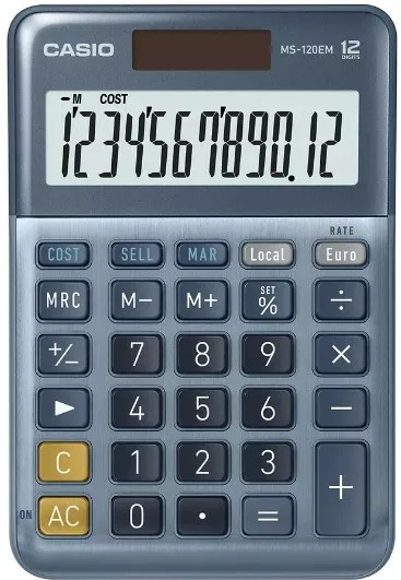 Calculadora de sobremesa de 12 dígitos con pantalla estra grande. Conversión Euro. Cálculos con porcentaje. Cálculos con tasas (MS-100 TER y MS-120 TER). Teclas en formato grande. Alimentación: Solar y pilas (1 x LR54 incluida). Dimensiones: 28,8 x 1Marca:CASIO Ref. Marca:MS-120EM