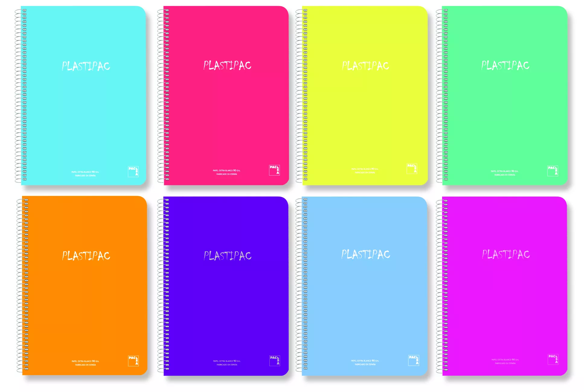 Cuaderno de 80 hojas en papel extra de 90 gr. con margen. Tapa extradura de polipropileno. 8 colores surtidos. Marca:PACSA Ref. Marca:16573