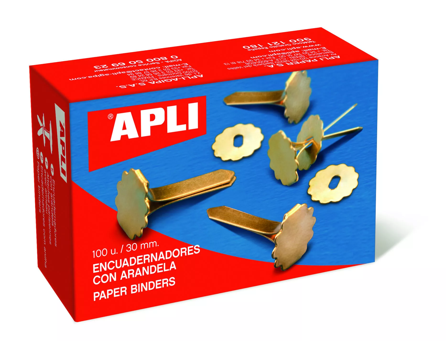 Encuadernadores metálicos latonados con arandela en cajas de 100 unidades. Cabeza Ø 12 mm. Especiales para juntar papeles y archivar documentos (informes, reportes, etc.). Marca:APLI Ref. Marca:12286