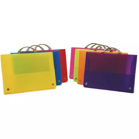 Maletín fabricado en polipropileno translucido rígido, color violeta. Dispone de dos broches como sistema de cierre en color gris. Con asa abatible. Tamaño manajeble 345x245x40mm. Marca:GRAFOPLAS Ref. Marca:30100535