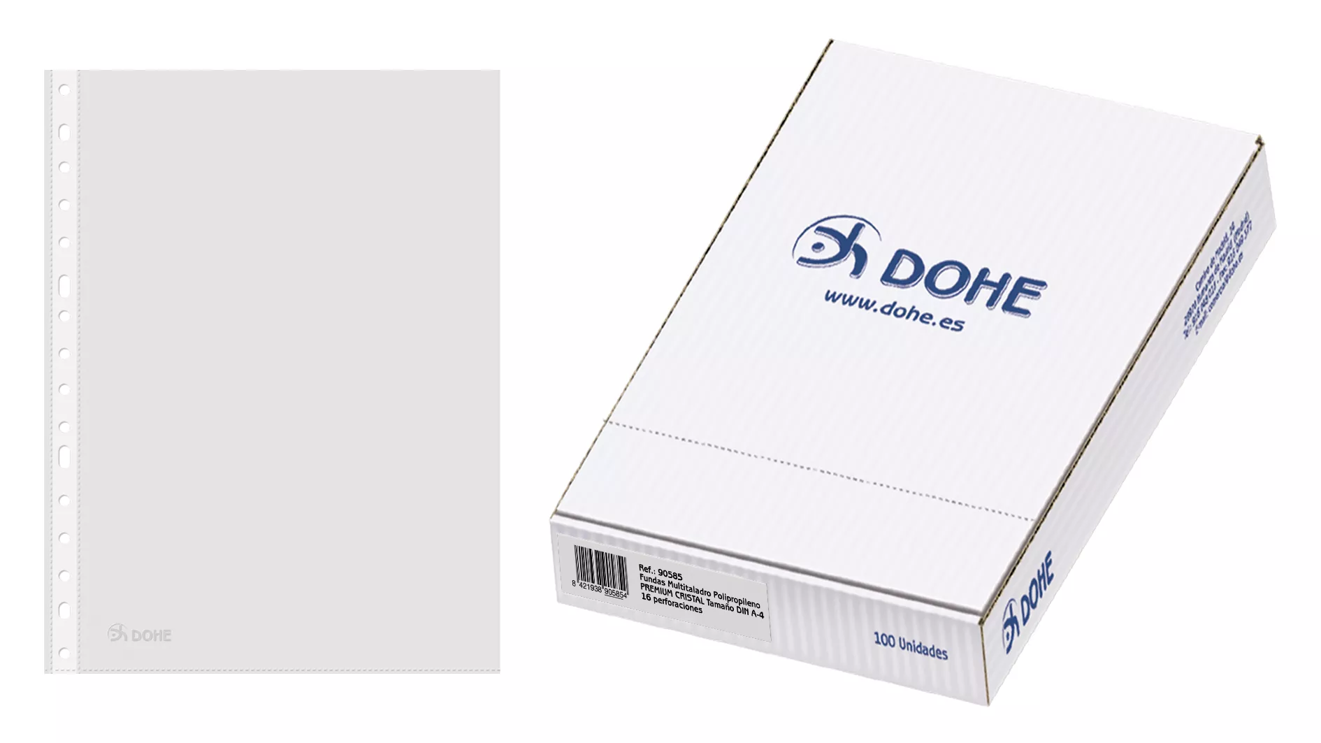 Fundas multitaladro con 16 perforaciones en polipropileno liso cristal. Se sirven en estuches de 100 unidades. Marca: DOHE Ref. Marca: 90585