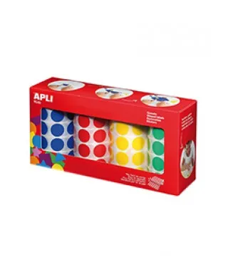 uches 4 rollos de circulos de 20mm, con adhesivo permanente en colores surtidos: amarillo, azul, rojo y verde. 1770 circulos por color haciendo un total de 7080 circulos surtidos Marca: APLI Ref. Marca: 13793
