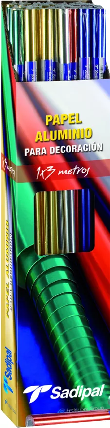 Papel metalizado aluminio en rollos continuos (1 x 3 m) o rollos semiperforados (0,5 x 16,25 m) en 25 hojas. Disponible también en expositor de 50 rollos de 1 x 3 m. (11 oro, 9 plata, 6 rojo, 6 azul ,6 verde, 6 fucsia y 6 cobre). Marca:SADIPAL Ref. Marca:12739