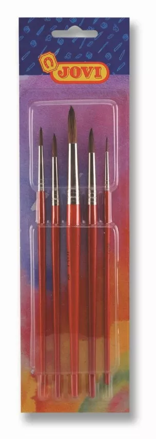 Pinceles calibrados de uso escolar. Este paquete consta de 5 pinceles surtidos de las medidas 0, 4, 6, 8 y 12. Ideales para todo tipo de trabajos manuales, para aplicar tempera, acuarela, cola blanca.... Marca:JOVI Ref. Marca:8185