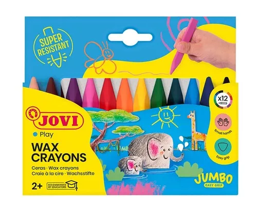Ceras triangulares que ni manchan ni se rompen. De colores vivos y luminosos, su diseño triangular permite que se adapten perfectamente a la mano del niño y que no rueden. Permiten un trazo suave y homogéneo, y se deslizan muy bien sobre el papel, son muy agradables al rayar y no manchan las manos. Son de gran rendimiento, ya que todo el lápiz es mina y se les puede hacer punta con facilidad Marca: JOVI Ref. Marca: 973/12