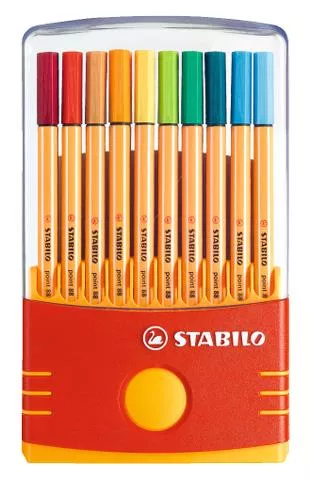 uche rígido desplegable de 20 rotuladores de punta de fibra de 0,4 mm con refuerzo metálico. Cuerpo naranja con las inconfundibles líneas claras longitudinales. Capuchón ventilado del color de la tinta. Idóneo para trabajos con reglas y plantillas. Marca:STABILO Ref. Marca:8820-03