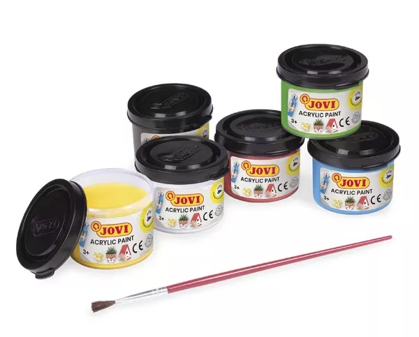 Pintura plástica a base de agua y látex, que proporciona un acabado satinado. Puede utilizarse en cualquier tipo de superficie. Es lavable y resistente al agua. Puede barnizarse para obtener un acabado más brillante. Botes surtidos de 55 ml. Marca:JOVI Ref. Marca:670